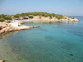 35) This is Alan's artsy shot taken over the side of the boat taking us to Moni. The island of Moni, shown ahead of the boat, is relatively barren but does have a nice cove with a beach area. Alan tried to hike to the highest point on the island while Jonna sunned on the beach but was thwarted by a fence running all the way across the island.