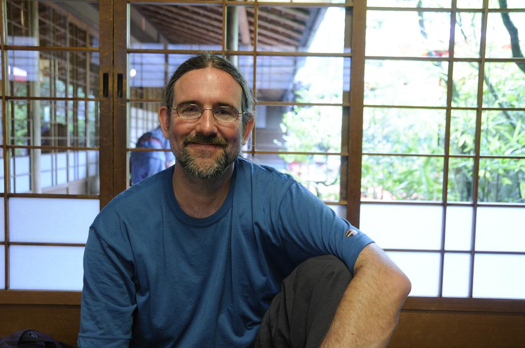 12) Alan taking a break in the shade on the second day in Kyoto. We rented two bicycles from KCTP, this time without a guide, so we could get around more easily. This photo was taken at around 8am and it was already starting to get warm!