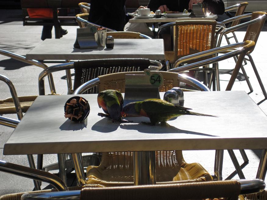 1) Thanks to an airline snafu, our Australia vacation started with an unexpected day in which to explore Sydney. The first new experience for us was having wild parrots join us for lunch at a small outdoor cafe near the harbour. The guys flew in and started tearing open sugar packets on the neighboring table. The cafe's staff gave exasperated shrugs and left them alone.