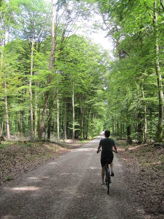 57) The barge generally stopped for the day a little after lunch, giving us the afternoon to explore the area around where we were moored. Alan and Jonna frequently took off on the bicycles. On the first afternoon we had a terrific ride through a thick forest to the village of Bouzey.
