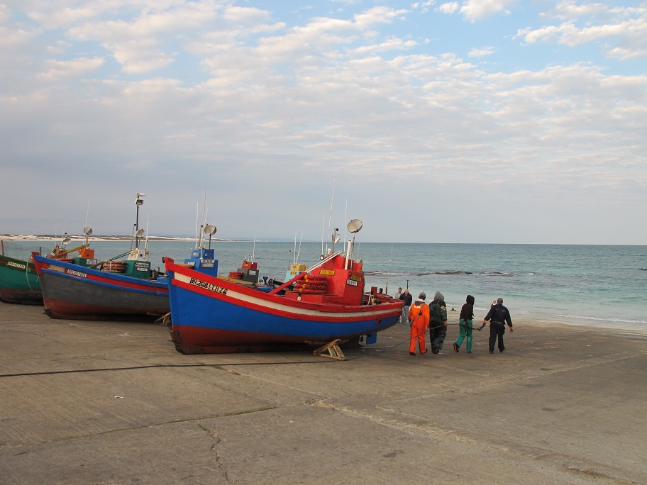 51) An unexpected highlight of the day was watching the local fishing fleet come ashore at sunset. We happened to look out the window at the right time to see the first boat coming into port. We ran down to the beach and watched as the colorful boats, the weathered fishermen and their loads of fresh fish were pulled ashore.