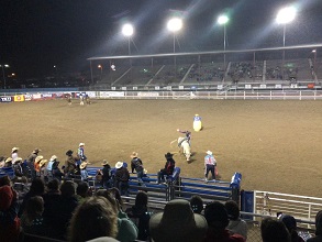 111) We ended our first day in Wyoming by setting up camp at another KOA Kabin, this time in Cody, and then went to the famous Cody Rodeo for an evening of pure Americana: Cowboys, patriotic songs and no small amount of blatant commercialism.