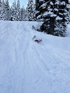 21) Johnsville, CA, January 1, 2023 - Jonna was also playing hard. There is a steep hill near the parking lot with some pretty big bumps on it. Jonna rodeo'ed her way down that hill a few times getting completely covered with snow every time. Yee-haw! This resurrection of our tradition of meeting up in Graeagle for New Year's Eve was a unqualified success. We all had plenty of fun and maybe have re-started the tradition with a new generation.