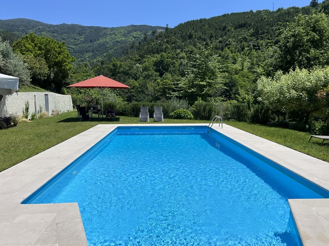 86) Vila Cova à Coelheira, Portugal, June 2, 2024 - Our original plan had been to find lunch at a village on the mountain and then do another hike in the afternoon but Jonna was feeling low energy so we headed back to our hotel instead to spend a lazy afternoon hanging out under a big umbrella by the pool. The temperature was in the upper 80s so relaxing in the shade while eating a snack lunch, writing postcards, listening to podcasts and researching things to do in Porto became the second half of our day. We both agree that this hotel, Casa de Ribeira de Cirio, was our favorite of this trip. If you are ever in the region of Parque National Serra da Estrela then book this place! It is hard to find but well worth it! At 5pm we reluctantly got back in the rental car and drove back into Seia to find dinner. The caretaker at the hotel had suggested Sei Lá and it was a great recommendation. A Japanese/American mash-up with sushi and burgers on the menu. Yummy! We drove back to the hotel feeling rested.