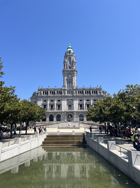 95) Câmara Municipal Do Porto, Porto, Portugal, June 4, 2024 - After threading the bikes through the line of people waiting for their allotted time slot to go in we cycled over to the Porto City Hall and the wide Avenida dos Aliados (Avenue of the Allies). We all stopped at a cafe for coffee/tea and custard tarts where we chatted and watched life stroll past.
