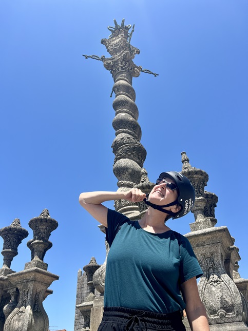 96) Pelourinho Se Catedral Porto, Porto, Portugal, June 4, 2024 - After our break we then climbed to the very top of the hill which makes up Old Town Porto to the Porto Cathedral. One interesting story from this area. In the 16th century this cathedral was the center of the Portuguese Inquisition and a pillar was constructed in the square in front where those found guilty by the Inquisitors were hanged. After the Inquisition ended the pillar was removed. However, during the dictatorship of Salazar (1933-1974) he had a replica of the pillar re-installed in the square - clearly a threat/warning to his detractors. The replica still stands today giving guides a very interesting site to explain. The cathedral was our final stop and after a short further cycle we were back at the Blue Dragon office to return the bikes. As with our bike tour in Lisbon doing this as our first activity in Porto gave us both a physical layout of the place but also some historical and cultural background which is useful as we explore on our own.