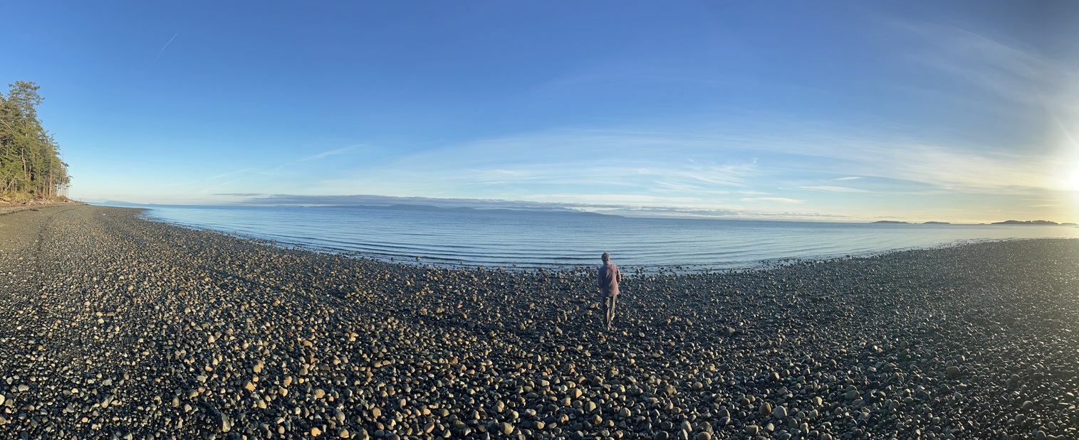 43) Rathtrevor Beach Provincial Park, Parksville, BC, October 5, 2025 - Jonna is always happy on a beach! In the evening the tide was out which gave us a wide, stony beach to explore.