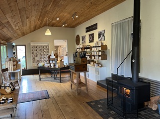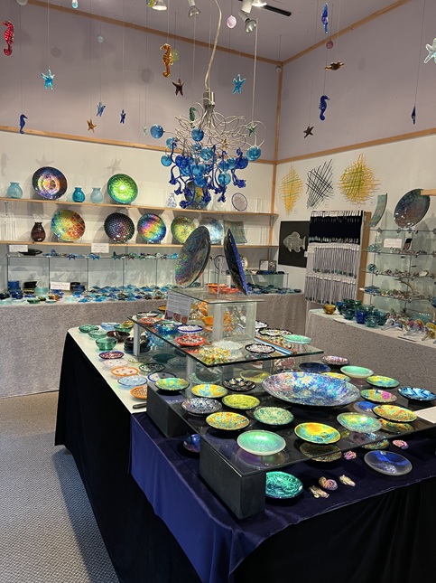 59) The Glass Foundry, Salt Spring Island, Ganges, BC, October 10, 2025 - In the morning, despite it raining, we hopped on the Zero to explore Ganges. Our first stop was at The Glass Foundry to see the glasswork and meet the "interesting" glassblower. Next we rode into town where we visited the ArtSpring art space to see the Parallel Art Show (PAS) art show. This is a juried art competition open to artists in the Southern Gulf Islands area. Our friend Mig, who we'd seen in Revelstoke, had a friend with a piece in this show which is what prompted us to check it out. There were some interesting pieces so a worthwhile stop.