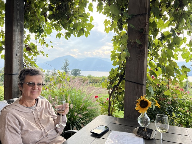 20) Deep Roots Winery, Penticton, BC, September 27, 2025 - The road between Penticton and Narawata is covered with wineries, cideries, breweries and distilleries all turning the area's fruit into craft drinks. We don't drink but we decided we should at least taste the regional products since it is clearly the area's major commodity. Once we got back to the camper we found a nearby vineyard and headed there to do a tasting. The wines were just okay but what was enjoyable was sitting on a covered patio looking out over the rows of grape vines and down onto the Okanagan River.