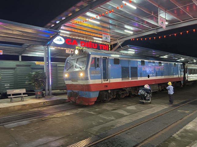 146) Reunification Express Overnight Train, Quy Nhơn, Vietnam, February 25, 2025 - The bus brought us to the Quy Nhơn train station. We got there 30 minutes before our train (which only stops at this station for about 5 minutes to unload and load passengers so we stayed in the lounge until the announcement to prepare. We were quite efficient and were settled into our car before the clickety-clack of the wheels could be heard. I had my lukewarm pesto fettuccine and cold cheesy bread, washed down with an "orange drink" (aka Tang) from the train station vending machine. Better than last night’s frozen veggie pizza but it is safe to say I was looking forward to more delicious Vietnamese food once we arrived in Ho Chi Minh city the next morning. As the train rolled down the tracks I spent some time trying to make a visible dent in the so called mattress on my sleeper car bed.