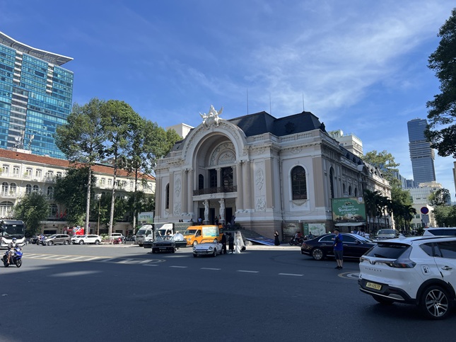 150) Nhà Hát Thành Phố Hồ Chí Minh (Saigon Opera House), Sài Gòn, Vietnam, February 26, 2025 - One interesting cultural experience was visiting the Opera House. This is another classic French Colonial building with a grand arched facade. In self-crazed Asia the entrance of the Opera House has become an insanely popular spot for photographs and in addition to the usual cloud of teens crowding the steps for selfies there were also many couples dressed in fancy clothes getting wedding photos at the Opera House. Out front, there was a smattering of classic cars including a Triumph convertable and an American Ford Mustang that were also being used as props for photos. Finally, the ultimate example was a professional model with a full photography crew was strutting her stuff in a slinky dress while a couple of bouncers tried to run off anyone who dared photo the whole spectacle.