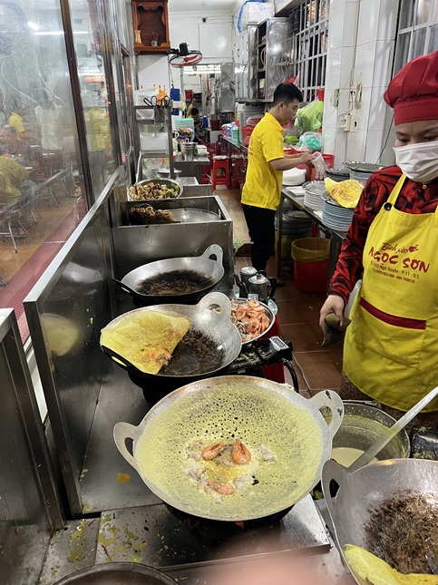 159) Scooter Food Tour, Sài Gòn, Vietnam, February 26, 2025 - With this course done it was back on the scooters for a 5 mile drive to Cholon - Ho Chi Minh City’s Chinatown and at 3 million residents possibly the largest "Chinatown" outside of actual China. We visited an actual sit down restaurant that specializes in a rice pancake that is made in a wok. It usually contains pork and shrimp but we decided to split a vegetarian version made with mushrooms, bean sprouts and green onion. The pancake is eaten by tearing of a bite sized chunk then wrapping that up in a stack of greens including lettuce, purple herb, fish mint, spearmint, basil, and a couple of others I’ve already forgotten. Then resulting tightly wrapped "cigar" of greens and pancake is dipped in a sauce - normally based on fish sauce but in this case based on soy sauce with various herbs and spices. We again took our time and enjoyed a fun conversation.