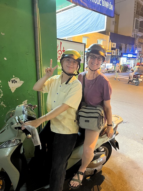 160) Scooter Food Tour, Sài Gòn, Vietnam, February 26, 2025 - Next we had a quick stop at another street vendor. This family makes Banh Mi sandwiches and what makes them unique is they have a portable oven they set up on the sidewalk each day to make their on fresh baguettes. We each had half a sandwich - mine with egg omelette and Jonna’s with pork. Very tasty but also simple flavors (especially compared to the gourmet vegan banh mi I’d had for lunch.) I didn't get a photo of the sandwhich but I did take a photo of Rachel and Jonna as we were leaving.