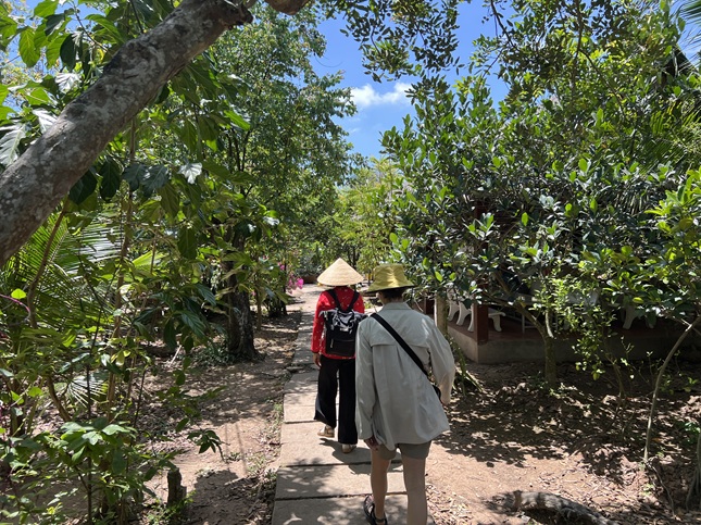 176) Thanh Tân, Bến Tre, Vietnam, February 27, 2025 - Our plan for lodging was a homestay with a family a couple of miles away. For the journey from the market to the homestay we loaded into two tuk-tuk trucks and bounced down a very rough road into town. Rough on the kidneys! Once we got to town and into a proper paved road the tuk-tuk ride wasn’t as uncomfortable but we only went a few blocks before it was time to unload. Then we walked about a 1/4 mile on a little paved path out to a smaller branch of the Mekong. Our homestay is a beautiful compound with a covered wooden deck built out over the river and a house with separate private rooms for us. The beds are rock hard but otherwise it is a nice place. We rested for about an hour, then met up at 5pm for an hour guided walk through the neighborhood. We got to see how each of the houses here has its own small canal that is used to water whatever they choose to grow and to hold whatever fish they want to raise. There were beautiful flower gardens, coconut farms, miniature fruit orchards, small animal farms for chicken or geese, and others filled in to house a business.