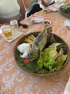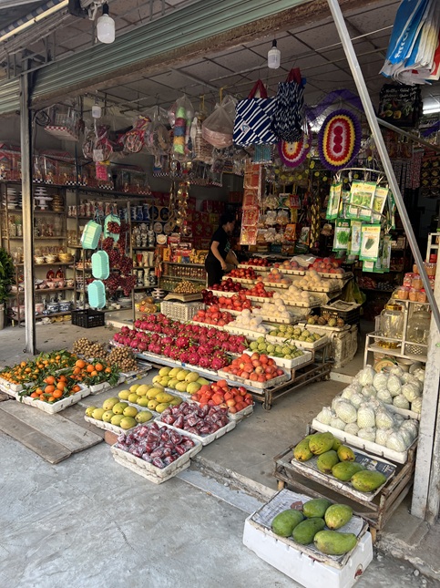 177) Thanh Tân, Bến Tre, Vietnam, February 27, 2025 - Our tour then went back into town where we visited the fruit market and walked to a bridge over a different canal. Then we turned back and took a different route back to the homestay. This was a much more enjoyable way of seeing life in this area than the tour this morning...but I also didn’t spend any money so in that sense I was just another gawker so I was just shifting the balance I mention earlier in my favor. Back at the homestay we had s brief waiting period where we went out on the deck to watch the bats emerging to zip around (hopefully eating mosquitoes!) I didn’t explicitly say it but this whole area is a marsh so there is standing water everywhere. We were all slathered in bug spray and even then we each had a few bites. As the sunset we started dropping the mosquito nets over our beds and reapplying the deet. Dinner was outside in a breezy courtyard beside the house. It was another expansive affair with about eight different dishes served by the very cheerful hostess. After dinner I grabbed a quick shower and headed straight to bed hoping many hours of rolling around on the hard mattress might equal a shorter amount of quality sleep. One possible complication to that plan is a Communist Party building just upriver from us that was blasting patriotic songs from some outdoor speakers. Thankfully, the shut down whatever wass being celebrated soon after we hit the bed.
