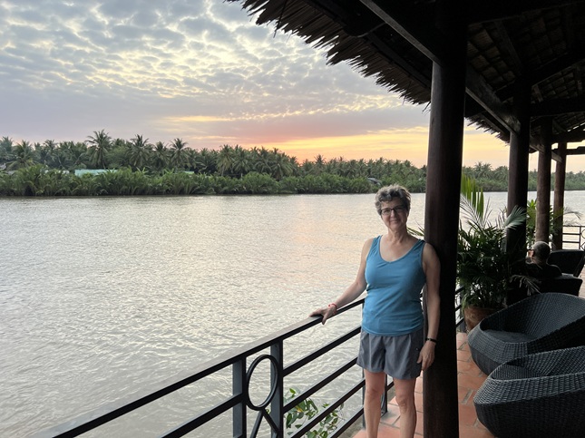 178) Mekongstay Bén Tre Homestay, Thanh Tân, Bến Tre, Vietnam, February 28, 2025 - I am not gonna lie, my night on the rock hard bed at the homestay was as bad as I expected. The homestay, Mekongstay Bén Tre, really was a lovely place and the hostess, Trì Văn Nghiêp, was very sweet so I don’t want so say anything disparaging about them. But the bed - Ooof. I ended up getting up a few times during the night and tried to give my shoulder and hip a break but I didn’t want to spend too much time out from under the mosquito netting. I was fried by the time 5:30am rolled around which was when our guide had recommended as the wake up time for those who wanted to watch sunrise over the Mekong. The sunrise wasn’t particularly spectacular this day but the homestay family did put out coffee and tea for those who got up early. I had two cups of dark, sweet Vietnamese coffee and that just about kept me awake. Breakfast was eventually served - omelettes, fresh watermelon, warm baguettes and deep fried banana fritters - and then it was time to pack up for the two hour bus ride back to Ho Chi Minh City. We again walked the 1/4 mile to the edge of town and boarded the bus. After an hour I was nodding off but we stopped for a bathroom and coffee/tea break so I was able to top the blood-caffeine level back up with an iced tea. Another hour and we were back at our hotel in HCMC.