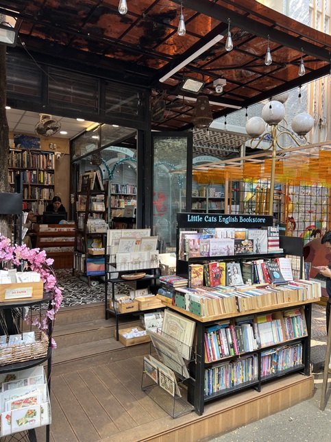 179) Ho Chi Minh City Book Street, Sài Gòn, Vietnam, February 28, 2025 - When Jonna and I checked in we saw we had a different room than before. When we opened the door to our new room and I saw the big, squishy bed I nearly burst into tears of happiness. However, I also knew that if I laid down then I would be out for the day and we had some tasks to take care of. First was sorting out the laundry we had dropped off two days ago. Next was getting lunch - we made a loop around the block where we purchased the same things we’d gotten our first day here. A papaya salad for Jonna and a veggie banh mi for me. Creativity isn’t my strong point when my brain has shut down to essential processes only. After lunch we had to prepare our final gift for our guide Minh. The tour we booked with Intrepid was both Vietnam and Cambodia. However, in reality it is two separate tours back-to-back with separate guides. So this night was the Farewell Dinner for the Vietnam tour and our final time with Minh. The next day we would move to another hotel and start the new tour with our Cambodian tour guide. Anyway, we got a card and a farewell gift for Minh but still needed to get some Vietnamese Dong (cash) as a tip so it was back out the door to find a bank. We had also bought Vietnamese stamps for four postcards so we needed to find those as well so after the bank we went to Book Store Street to peruse the postcard options. Jonna found some she liked so check that item off the todo list.