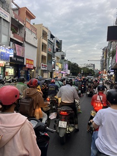 154) Scooter Food Tour, Sài Gòn, Vietnam, February 26, 2025 - We bused back to the hotel where Jonna and I sent some dirty clothes out to he laundered and then rested in the room for a couple of hours. At 5:30pm we headed back out for a special tour we had booked independently - a three hour food tour of Ho Chi Minh City done via scooter by Top Notch Motorbike Street Food Tours. We had two riders, both very energetic twenty-somethings who spoke great English and that were confident, skilled riders. Daniel and Rachel picked us up in front of the hotel and after a quick introduction we were off into rush hour traffic. It is hard to articulate what riding a scooter in a town of 13 million people is like. It is analogous to jumping into a river - just being submerged and completely surrounded by a steady, unstoppable flow. We literally brushed knees and elbows with the other riders around us and when our riders needed to turn they just turned. Whether it was crossing oncoming traffic or merging with traffic going the same direction. The other traffic just makes room - people rarely stop - and there is no ego or drama. Space is needed and space appears. Everyone adjusts and the river keeps flowing. It is just amazing to see in person.