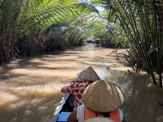 173) Con Phung (Phoenix Islet), Bến Tre, Vietnam, February 27, 2025 - Next up we boarded wooden canoes and had a paddle through the water coconut groves. This was actually quite pleasant but unfortunately didn’t last very long. Again, just a sampler. The canoe dropped us off at a set of pavilions used to serve lunch to tourists doing the tour path.