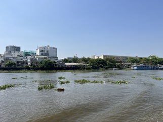 184) Sông Sài Gòn Waterbus, Sài Gòn, Vietnam, March 1, 2025 - The first day of our new tour was primarily about logistics so not a lot to share. We got up early and had breakfast at the hotel. Then we packed up our luggage and checked out of our room. We stored our bags in the hotel luggage room to be picked up in the afternoon. Then we were off to do one sightseeing activity before our tour schedule dominated the rest of the day. The weather is Saigon is always warm and even at 9am that was true. We knew the temperature would be going up as the sun got higher in the sky so doing our outing in the morning would spare us the worst of the heat. It was a thirty minute walk, at a brisk pace, to go the 1 1/2 miles from our hotel to the Saigon River. There are fancy sightseeing boat trips you can do on the river but a traveler’s tip we read in a travel book is the Saigon Waterbus. The government introduced this about 10 years ago to try to ease traffic. It is a commuter ferry that travels along the Saigon River with a dozen stops along the way. A one-way ticket costs 15,000 Dong ($.60) and the trip takes about an hour with boats leaving the main pier every 90 minutes. As a bonus there is a Starbucks at the pier so we could get some decent tea while we waited for the 9:30am boat. The ride was mellow with some nice views of the city skyline and it was interesting to see the other river traffic as freighters and barges sailed past.