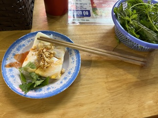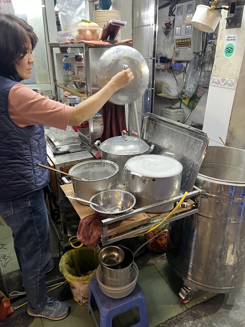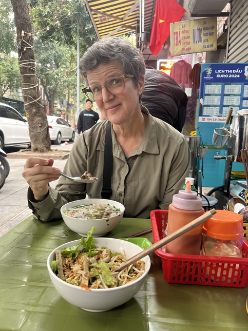 10) Tiệm Sốt Xê, Hanoi, Vietnam, February 12, 2025 - However, when we arrived back at our hotel we were hit with a big surprise – we are doing a small group tour starting on the 15th and had asked the tour company to book us four additional nights at the hotel. Unfortunately, they only booked us for one night so we suddenly found we didn’t have a room for the next three nights and we were an hour late checking out of the room. Yikes! Fortunately the hotel had availability for tonight so we handed them a credit card to book that room which bought us time to deal with the situation. Over the next few hours we got it resolved – we will be staying at the same hotel all three nights but will switch rooms a couple of times. That was an adrenaline rush which helped keep us awake after the short night’s sleep! While this was being figured out with the tour company we headed back out to the neighborhood just to the north of us to find lunch. We found a small sidewalk Phó shop that fit the bill. Two bowls of noodles, Jonna’s with beef and mine with tofu, came to $3 total. Wow, so good and so cheap it was amazing.