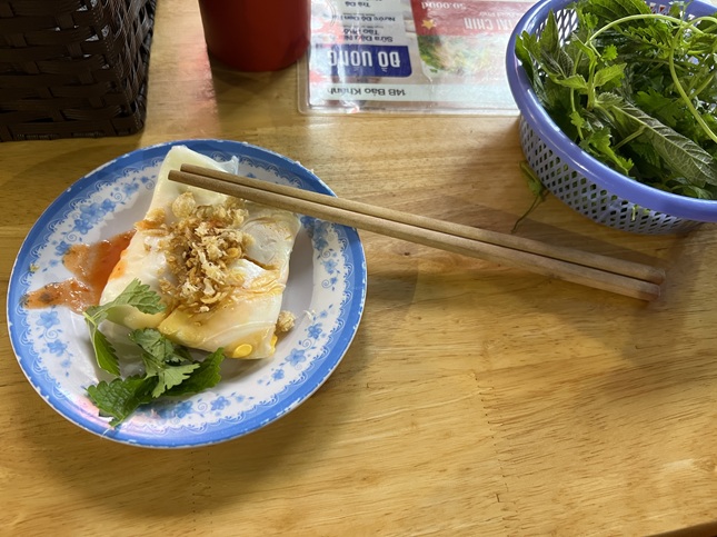 15) Hanoi Street Food Tour, Hanoi, Vietnam, February 12, 2025 - At our first stop we had steamed rice pancakes filled with pork or egg.