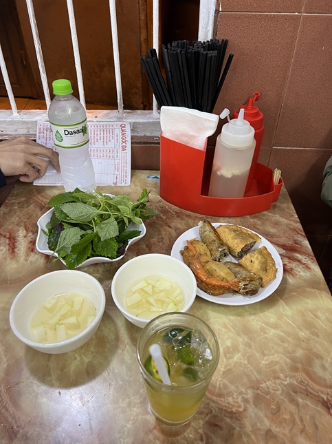 19) Hanoi Street Food Tour, Hanoi, Vietnam, February 12, 2025 - Pork stuffed pillows, pork spring rolls and shrimp cakes. I skipped the meat but did have a tasty kumquat tea.