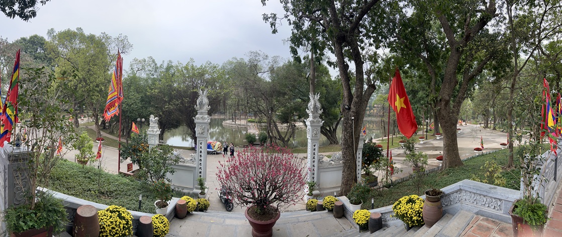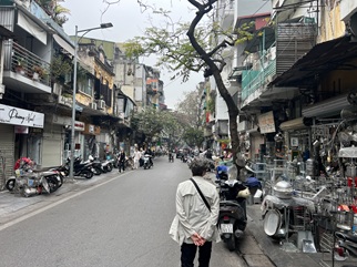 2) P. Quang Trung, Hanoi, Vietnam, February 12, 2025 - Next we cast our sight further afield with a 30 minute walk to Hoàn Kiém Lake – the center of Old Hanoi. Along the way we got a sense of Hanoi – sidewalks packed with parked scooters and pop-up food stalls. Every stop light was a drag race start for dozens of scooters, many loaded down with a family of four or stacked high with goods. Cars squeeze three wide on a road marked for two lanes. Old men in military uniforms patrol the streets and young people walk blindly through traffic with their eyes firmly fixed on their cell phones. Red and yellow flags fly in front of every building and murals of "Uncle Ho" look down every few blocks. The air pollution makes your eyes sting and, despite lots of shop owners sweeping in front of their stores, every walking surface is covered in things you’d rather not think about. Tet, aka New Year, just passed and there were flowers bursting out in all the parks – peach blossoms and roses and chrysanthemums were everywhere.