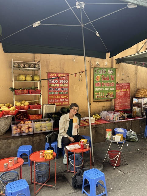 9) P. Lý Thường Kiệt, Hanoi, Vietnam, February 12, 2025 - From there we headed back to the hotel to figure out lunch. Food is ever-present in Hanoi and shockingly inexpensive. Every street is covered with street vendors who set up carts on the sidewalk and spread out little stools and crates for tables and chairs. A typical meal might cost the equivalent of $1 or $2 and is cooked to order. Nearly all ice is made by one of two government run industries, left over from French breweries that were set up during the colonial era, and is safe for delicate western stomachs. This meant that Vietnamese Iced Coffee (dark roast coffee, sweetened condensed milk and ice) was on the menu to keep jet-lagged bodies functioning!