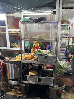 14) Hanoi Street Food Tour, Hanoi, Vietnam, February 12, 2025 - Then at 6pm we headed out for our final experience of the day – a three hour guided food tour with a local guide we had booked online a month ago. Our guide was a delightful young man named "Tony" who lives in the countryside outside Hanoi and who had learned English by watching American TV shows and movies. He was very good – we went to half a dozen different places ranging from street carts to full restaurants. We took a ride-share (Grab is the local Uber clone) to the Old Quarter and then walked to different food vendors in that neighborhood. For each place he explained it ahead of time, made sure he understood all our food restrictions and then ordered whatever specialties made each place unique. In nearly every case we could watch the vendor cook the dish.