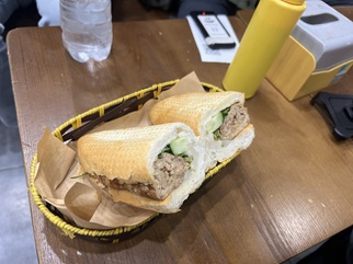 21) Hanoi Street Food Tour, Hanoi, Vietnam, February 12, 2025 - Next was the classic banh mi sandwich made with egg omelet and pickled cucumber. The street vendor Tony really likes wasn't serving this evening so we found a store-front shop just down the street for the sandwhich. The French baguette used for the sandwhich was perfect! One any French Boulangeries would have been proud to serve. Then with the soft egg and vinegary condiment it was divine!
