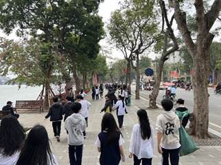 39) Hoàn Kiếm District, Hanoi, Vietnam, February 13, 2025 - Our energy was flagging so we relented to taking a ride share back to the Hoàn Kiém Lake area. Tony had offered to help us get International postcard stamps at the Post Office so we had the Grab ride share driver drop us off at the Central Post Office. Once we had our big stack of stamps we walked along the lake where we got to watch a group of middle school students who were on a work outing to pick up trash around the lake. Lots of giggling and laughing while running around with giant chopsticks picking up plastic water bottles, cigarette butts and scraps of paper. It was a somewhat fruitless task given the sheer amount of litter on the sidewalks but it was nonetheless cute to watch.